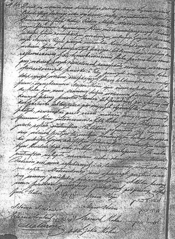 14. It took place in Warka on May 28, 1847, at six o?clock in the afternoon. Appeared Orthodox Jew Jeick ****, Rabbi of Warka City, along with Orthodox Jew Israim **** ****, bachelor living with his parents in Grojec City, born in Grojec from legally married Orthodox Jews Majer and Ryfka ****, [profession ? illegible and unrecognized], still living and residing in Grojec, eighteen years and eight months old; and along with Orthodox Jew Gitla **** ****, unmarried woman living with her parents in Warka, born in Warka from legally married Orthodox Jews **** and Tola ****, [profession ? illegible and unrecognized], still living and residing in Warka, nineteen years and seven months old. In the presence of the groom?s father, Majer ****, and the bride?s father, Szmurka ****, as well as the witnesses, Orthodox Jews **** ****, [profession ? illegible and unrecognized], 55, and Szlama ****, [profession ? illegible and unrecognized], 35, both residing in Warka; he stated that before them on this day, Israim ****, a single man, and Gitla ****, a single woman, got married in a religious ceremony; the marriage was preceded by three banns in Grojec on February sixth, thirteen, and twentieth of this year, and in Warka on April tenth, seventeenth, and twenty fourth of this year. He stated that the parents of the newlyweds verbally consented to the marriage and that nothing adverse took place. The newlyweds stated, moreover, that they did not enter into any premarital contracts. This document was read aloud in front of and signed by the present witnesses.